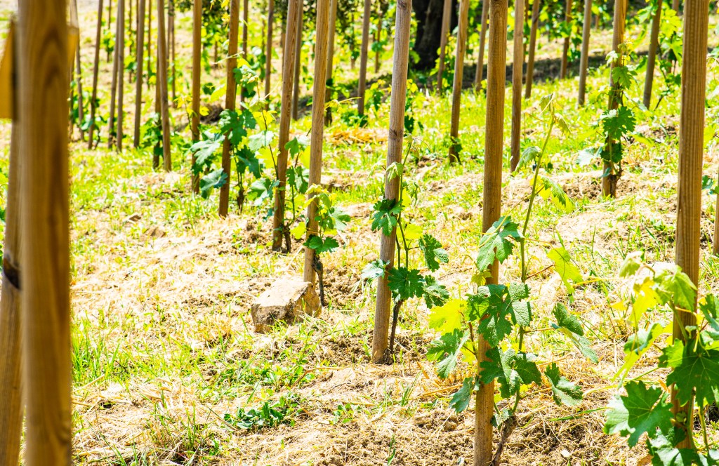 Avviato nel 2021 e presentato nel 2022, il progetto ha preso forma con l’impianto a sistema ad alberello – una delle forme di allevamento più antiche e qualitative – su un terreno esposto a nord-est. L’impianto segue una disposizione “a quinconce”, con ogni vite collocata ai vertici di una griglia geometrica che ne ottimizza lo sviluppo anche in forte pendenza. Non ci sono fili di ferro, ma tutori in legno e lavorazioni esclusivamente manuali.