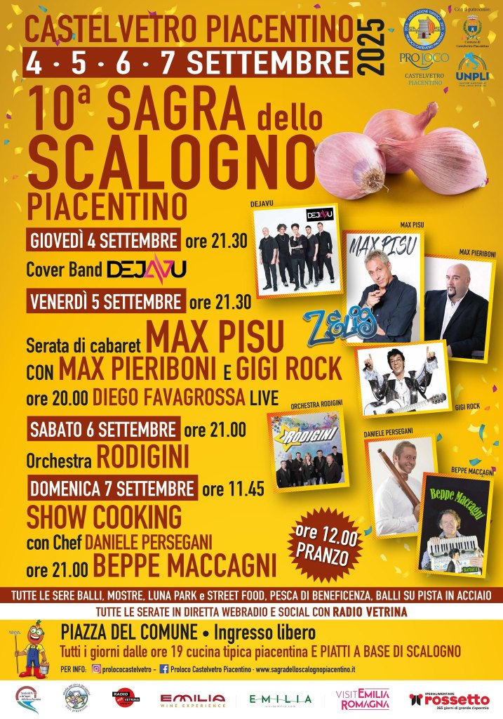 Dal 4 al 7 settembre il festival dello scalogno “Allium Ascalonicum” anima Castelvetro Piacentino. Negli stand gastronomici della Pro Loco lo scalogno è declinato in ricette per primi e secondi, accompagnate ogni sera da musica dal vivo e spettacoli comici. La Sagra dello Scalogno celebra la 10ª edizione domenica 7 settembre: alle 10:15 sono attesi l’assessore regionale Alessio Mammi e il presidente della commissione politiche economiche Luca Quintavalla, mentre alle 11:45 lo chef castelvetrese Daniele Persegani che presenterà una sua ricetta speciale abbinata dalla Strada dei Vini alla Malvasia di Candia Aromatica.
